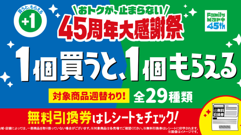 ファミリーマート45周年大感謝祭は、1個買うと1個もらえるという非常に魅力的なキャンペーンです。